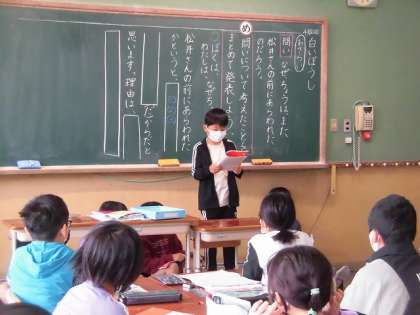 今日は,物語を読んだ上で「なぜ,ちょうは,また松井さんの前にあらわれたのでしょうか。」という問いに対しての自分の考えを発表しました。