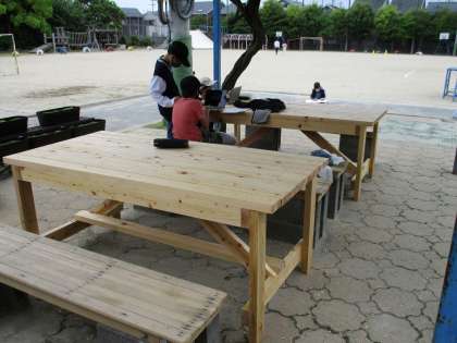 藤棚の下にあるテーブルが新しくなりました。研修ビデオの撮影を兼ねて,管理用務員さんが作ってくださいました。今回は木の風合いをそのまま生かしたもので,とても素敵なテーブルです。