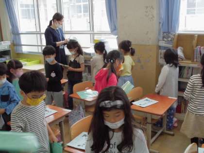 掃除の後は,配りものタイムです。担任のお手伝いとしてたくさんの配りものを,友だちの机まで配達します。名前を間違えないように,丁寧に配達してくれています。