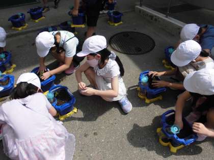 2年生ではミニトマトを育てます。1人ずつしっかりと水やりなどのお世話をし,