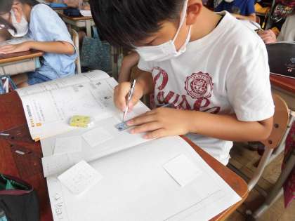 作図の学習では,子どもたちが三角定規がずれないように気を付けて学習を進める姿が印象的です。