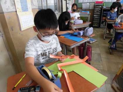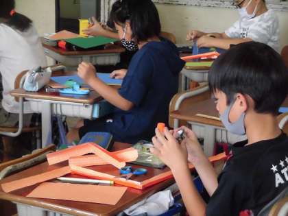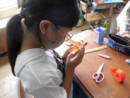 「方眼紙の10マス分切る」や,コンパスを使って「半径5cmの円をかいて切る」など,算数の学習で得た経験をもとに学習に取り組みます。