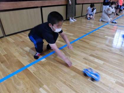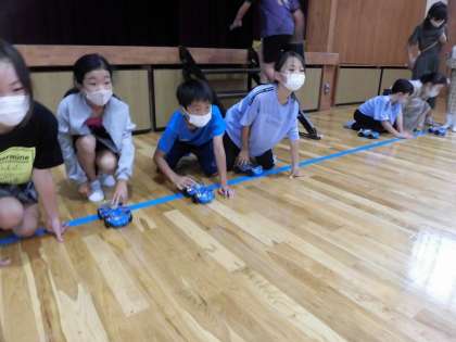 理科の「電池のはたらき」の単元で作成したモーターカーを使って体育館で遊びました。