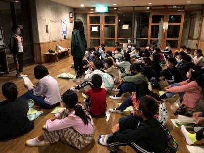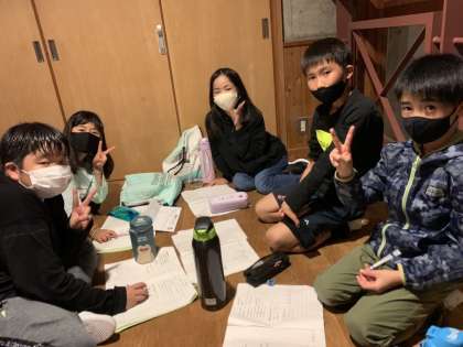 夜の反省会の様子です。一日目を振り返るとともに,明日の活動の確認もしました。