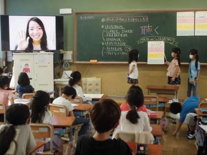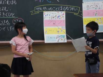 仲よしになった先生たちのことをポスターにまとめ,発表会を行いました。顔や名前は知っていても,好きなものや得意なスポーツなど,くわしく知らなかった子どもたち。互いに発表し合うこで,たくさんの先生のことを学ぶことができました。