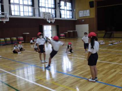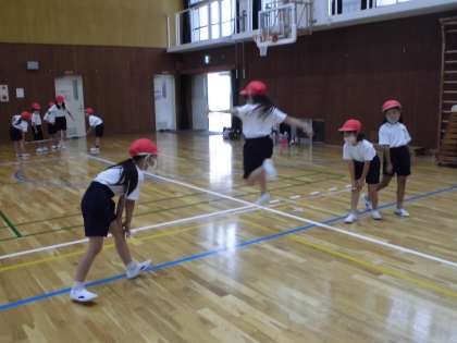 体育で「とびあそび」という学習に取り組んでいます。前回はグリコゲームで,どうやったら遠くに飛べるかを考えながら,楽しみました。2回目の今回は,ゴムとびあそびで,体の使い方を工夫しながら,高く飛ぶことにチャレンジしました。「腕を大きくふる!」「助走をつける!」「(かえるみたいに)小さくかがんでから大きくとぶ!」など,あそびの中から多くのことを発見していっていました。