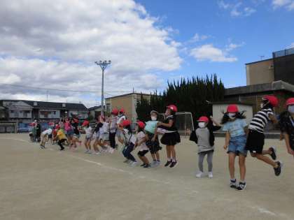 国語科の「くじらぐも」の学習で,くじらぐものお話の世界を思い浮かべながら,読み方を工夫していきます。今回は実際に運動場に出て,空にくじらぐもがいることを想像しながら,「おうい」や「ここへおいでよう」,「天までとどけ,1,2,3」という言葉を言ってみました。「空に向かって大きな声で言う」や「手まねきしながら言う」など,いろいろな工夫を見つけていました!