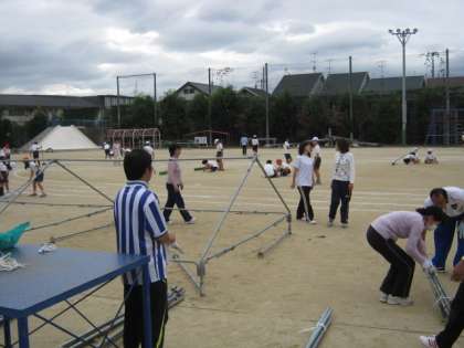 6校時に4年生から6年生で前日準備をしました。夜の間に雨が降ることも考えて,できることだけ準備しました。