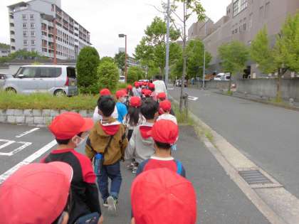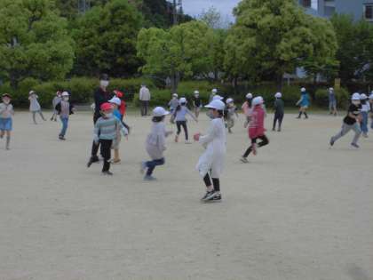 9日に折戸公園まで2年と一緒に出かけました。学校の外に出かけるのが初めてで,朝からドキドキしている子どもたちもいました。折戸公園では,鬼ごっこをしました。