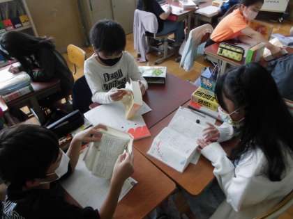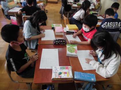 国語の学習で国語辞典を使う学習を行いました。国語辞典とは,一体に何のために使うものなのか学んだ後,実際に一つの言葉の意味を調べながら,繰り返し使ってみました。使い方が分かった後は,いくつかの言葉が,国語辞典の中でどのように並んでいるかを調べてみました。グループのみんなで,五十音を唱えながら,どんどん言葉を見つけ出し,使い方に慣れていきました。