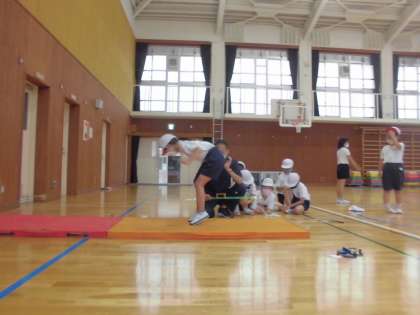 体育の学習で,スポーツテストを行いました。種目は「反復横とび」と「立ち幅とび」です。「反復横とび」は,初めて取り組む種目だったので,とぶリズムや足の動きに戸惑う子もいましたが,少しでも多く往復できるように頑張りました!