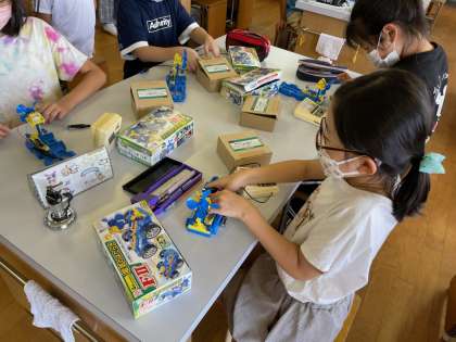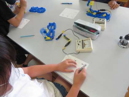 簡易検流計を使い,プロペラ,スイッチ,乾電池の回路を作って,電池を入れかえて調べました。