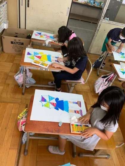 図画工作の学習で,6月の絵を描き始めました。まず6月は,「梅雨」の季節ということで,連想されるものや色をたくさん思い浮かべることからスタートしました。「雨」や「かさ」,「あじざい」などなど…,また「水色」,「赤むらさき」,「むらさき」など…を発表し,6月のイメージをたっぷり広げました。その後,傘を持っている自分の後ろ姿を,白い画用紙にどーんと大きく描いていきました。次回から,周りに絵具を塗って完成させていきます!