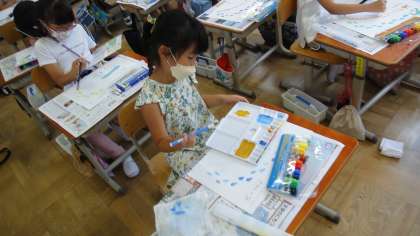 先週,図工ではじめて絵の具道具を使いました。今週,2回目の絵の具をすると,道具の名前や使いかたをよく覚えていて,すばらしかったです。2回目の絵の具では,2色混ぜて色々な色を作りました。「混ぜる量によっていろいろな色ができる。」「色がかわった。」と色の変化に気づきながら,ていねいに仕上げることができました。「3色混ぜてみたい。」「もっといろんな色をつくりたい。」ととても楽しそうに活動しました。