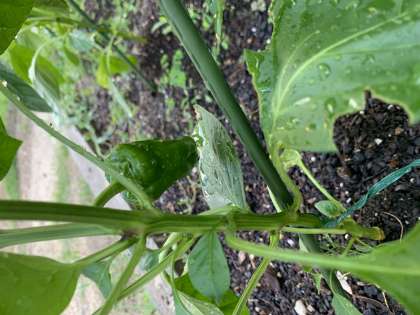 生活科「ぐんぐんそだておいしいやさい」の学習で育てているピーマンがこぶしほどの大きさになってきました。初めて収穫をし,「これはまだ小さいかな。」「もっと実がなってほしいなあ。」とつぶやいていました。ミニトマトも青い実がなっている子が増えてきて,赤くなるのが楽しみです。