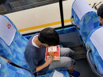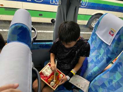 雨が降っているので、バスの中でお弁当を食べています。