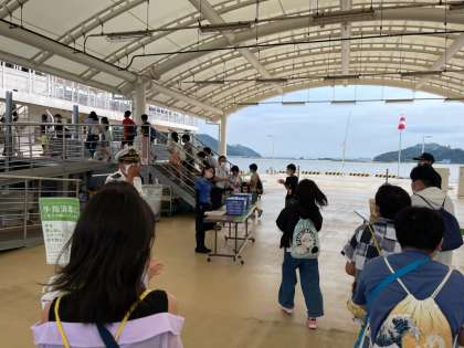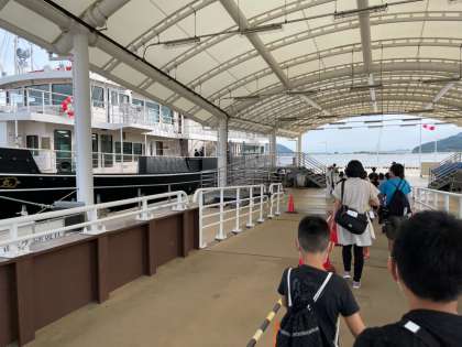 雨は上がり、晴れ間が差し込んでいます!今、渦潮観光船に乗り込みました。
