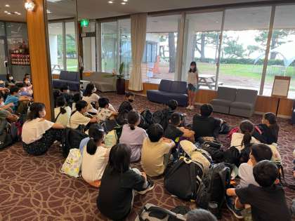 慶野松原荘に着いて、ロビーで入所式をしています。