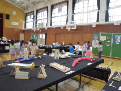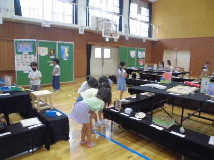図工の時間に地域交流作品展の見学に行きました。子どもたちの作品だけでなく、地域の方の作品が並んでいました。ちょうど作品を出品されていた方が鑑賞に来られていて、その方からお話を聞いている子どもたちもいました。ほかの子どもたちもオルゴールの音楽が流れる中、静かに鑑賞していました。