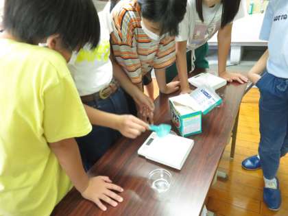 洗剤の量も,洗剤に書かれている「使用量の目安」から適量を量り,子どもたちは,「こんなに少なくて大丈夫?」と心配しているようでした。