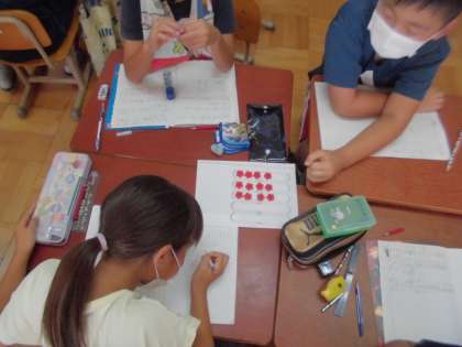 算数で新しい学習が始まりました。まず1時間目は,「13このあめを3つずつふくろに分けていくと,何ふくろできますか」という問題に挑戦します。問題を聞いた瞬間…,「あれ?おかしい。」とつぶやく子どもたち。あまりが出てしまうことにすぐに気が付いていました。実際に13個のおはじきを3個ずつ分ける活動をして答えをもとめ,あまりがある場合のわり算の式・答えの表し方を確認しました。