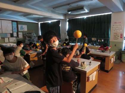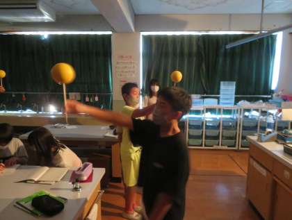 なぜ月の形の見え方が日によって変わるのか,理科室を暗くして,月の模型と太陽の代わりとなる電灯を使って実験しました。