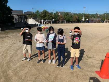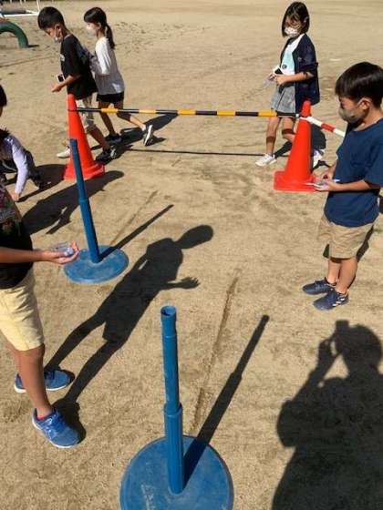 理科の学習で,影の位置が変わるのかどうかの観察を行いました。運動場に棒をたて,午前9時のかげの向きを調べ,印を付けます。その1時間後(午前10時)に,再度影の向きを調べ,影が動くのかどうか,またどのように動くのかを確かめました。子どもたちは,横にずれていること,また,影が短くなっていることに気付き,驚きの声を挙げていました!
