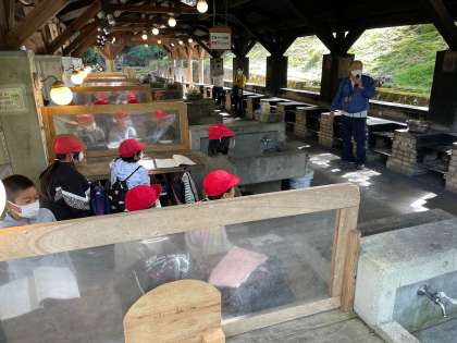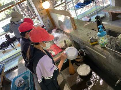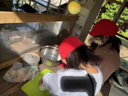 野外炊事の様子です!協力して、美味しい「鶏すき焼き風煮」使ってほしいです!!