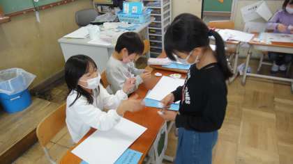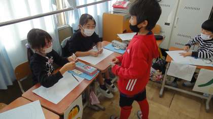 英語活動「サラダで元気」でお店屋さんごっこをして,サラダを作りました。「How many?」「5,please.」など,英語で会話することができました。もらった野菜を紙に貼るのが大変でしたが,とても楽しそうでした。