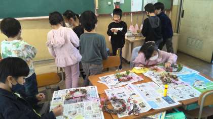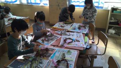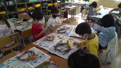 生活科「あきといっしょ」でアサガオのつるを利用したリースに飾りつけをしました。運動場で見つけたドングリやきれいな葉などを飾りました。