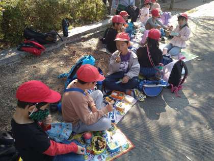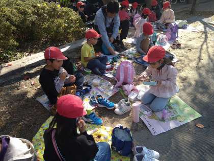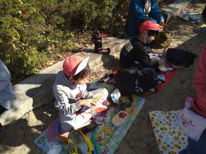 ウォークラリーをした後は、楽しみにしていたお弁当。ニコニコ笑いながらみんなでお弁当を食べました。