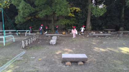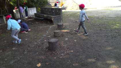 生活科の学習で「どんぐり」「色づいた葉」を使って、自分で決めたおもちゃや飾りを作ることにしました。運動場で、材料を集めました。