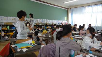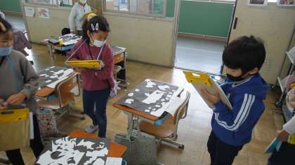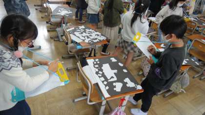 図工「はさみでアート」の学習で、作品交流をしました。今回は、絵を机に置いておき、いいなと思う作品を3つ探しに旅に出ました。多くの子が3人以上見つけ、いいところを交流しあいました。