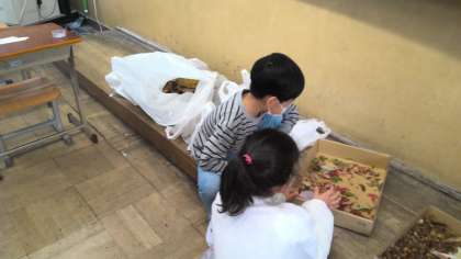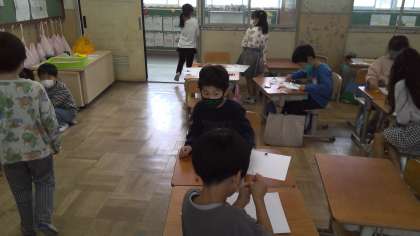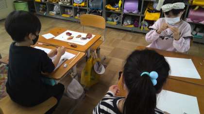 運動場で見つけたドングリ・葉などを使い、おもちゃや楽器などを作りました。友達と話し合って、工夫している子どもたちもいました。生活科室に飾り、友達と作品の交流をしたいと思います。
