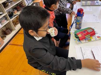 はじめに出汁を入れていないみそ汁を試飲し,その次に昆布だしのみを試飲,のちに鰹と昆布の合わせ出汁を試飲しました。ここまでは,子どもたちは「あまりおいしくない・・・」と言っていて,そこにみそを入れて初めて「おいしい!」という声が上がりました。
