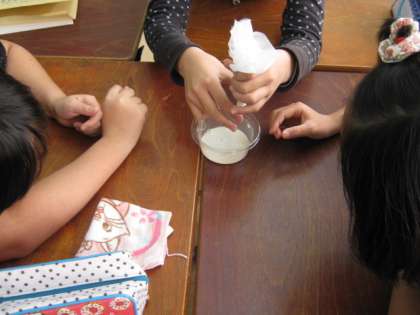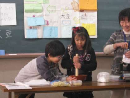 その場で作られる豆乳と湯葉に子ども達は大喜びでしたが、初めて食す味に「苦手〜」とか「甘い」「意外とイケル」といった声が聞かれました。「まずい」という声がなかったのは、食育をしている池田東として誇らしかったです。