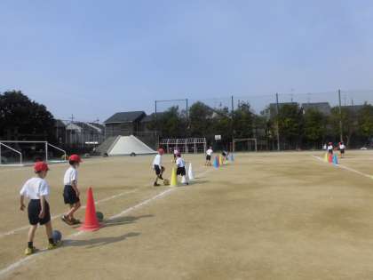 体育の「ボールけりあそび」の様子です。1人で1個のボールを使い、足でのボール操作の練習のために「ボールとお散歩」をしています。コーンの周りをグルグルと回ったり、コーンの間を走ったりしています。
