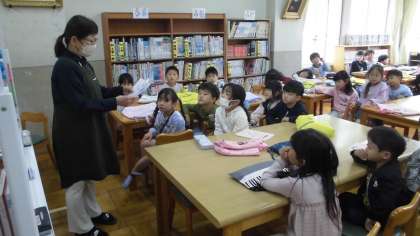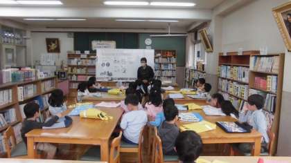 学校の図書室のオリエンテーションを行いました。学校司書の中村久美子先生に教えてもらいながら、「図書館での約束」、「読書ノートの使い方」などを教えてもらいました。