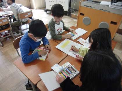 1年生に学校を案内するための準備をしました。場所の名前・何をするところなのかがわかるように絵や文を使って書きました。グループで相談しながら、活動することができました。
