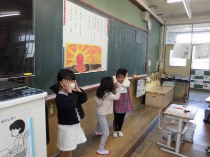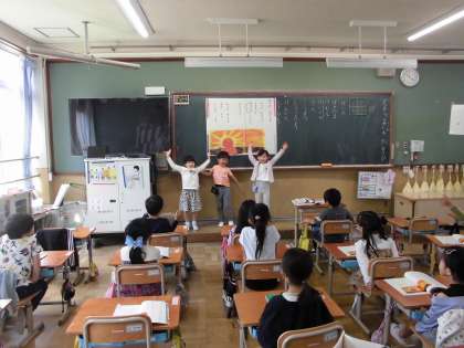 国語の学習で「あさのおひさま」という詩を読みました。「のっこり」や「おきだした」、「ざぶんと」などの言葉から考えた動きをつけながら音読を楽しみました。