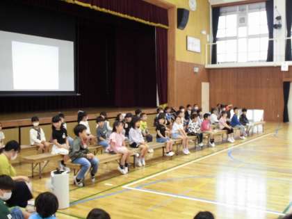 1年生を迎える会がありました。1年生のみんなは、自分たちのために送られた歌やダンス、クイズの発表に見入り、楽しい時間を過ごしました。そのあとは自分たちのお礼の発表です!朝からとても緊張していた子どもたちですが、緊張にも負けずのびのびと発表が出来ました。