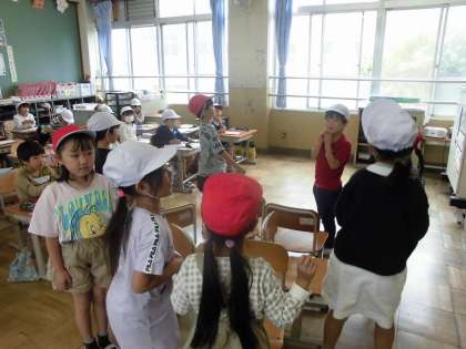 算数の学習で、6脚の椅子をめぐって「いす取りゲーム」を行いました。赤チームと白チームに分かれ、それぞれのチームが何脚ずついすに座ったかを確かめながら、「6」という数字がいくつといくつに分かれるのかを考えていきました。