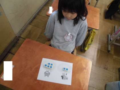 7の数をいくつといくつに分けることが出来るのか、ブロックを使って考えました。犬のお皿と猫のお皿の二つにどのように分けることが楽しみながら考えました。