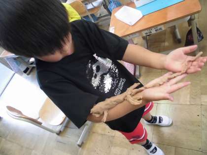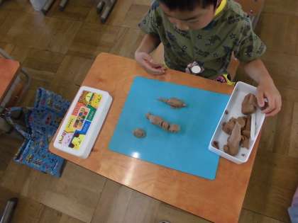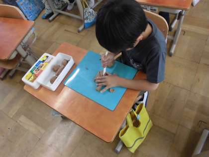 演劇鑑賞教室前の中間休み、外に出る時間がなかったので、教室内で粘土あそびをしました。粘土が大好きな1年生は大喜びで、熱中する様子が見られました。