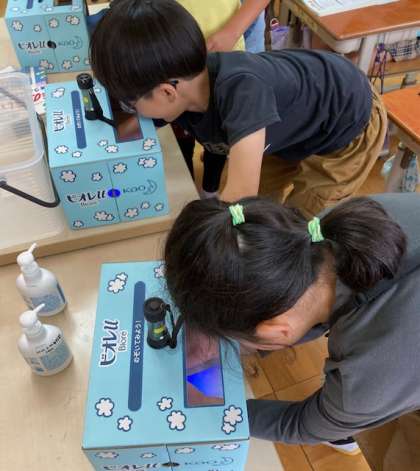 手洗い学習では、ブラックライトで洗い残しが一目でわかるクリームを使い、手が洗えているのか確認しました。