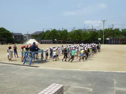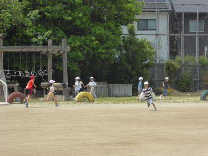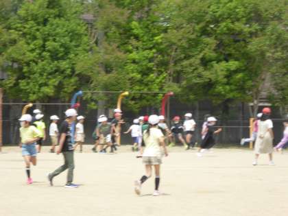 運動委員会の児童が企画したけいどろ大会が開催されました。2学年ずつに分かれて実施します。今回は2年生と4年生が楽しみました。
