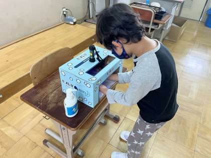 毎年行われてる手洗い学習なので、みんなしっかり洗い方を覚えていました。手に付けたブラックライトで光るクリームを一生懸命手洗いで落としましたが、なかなか落ちないことが分かりました。改めて手洗いの大切さを学びました。