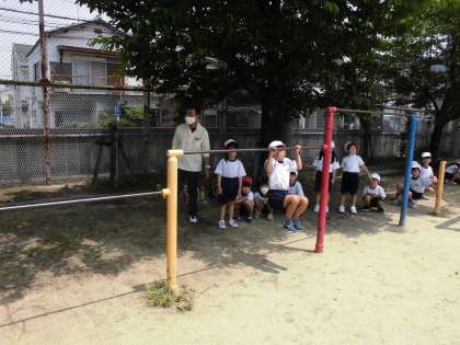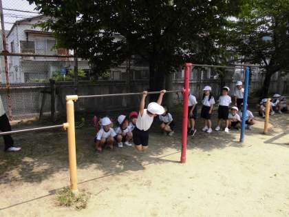 体育で鉄棒の学習が始まりました。1回目の今回は、基本的は「ぶら下がり」、「とび上がり(とんで鉄棒の上に乗りあがる)」、「前回り降り」などをしました。その後、保育園や幼稚園でできるようになった技も自由に見せてもらいました。