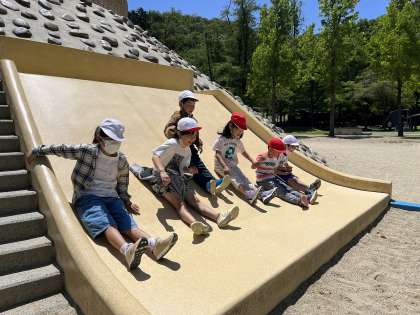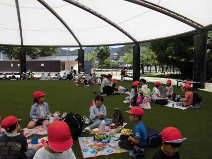 遊具で思い切り遊んだ後は、お昼ごはんのタイムです。お家の人に作ってもらったお弁当をとても楽しそうに食べていました。