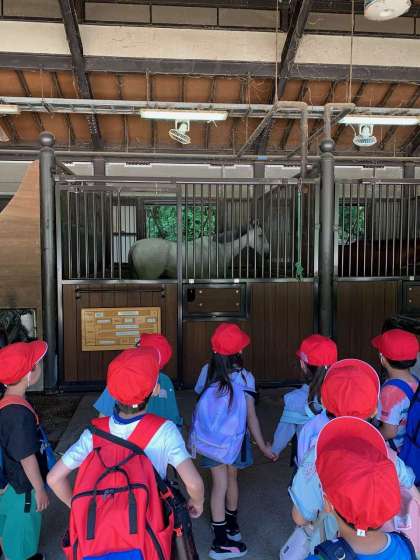 宝が池公園を出た後は、平安騎馬隊の厩舎に向かいました。子どもたちが前を通ると、顔をこちらにのぞかせてくれました。みんなとても喜んでいました。
